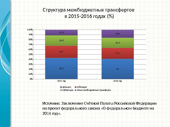2015 год 2016 год 0%10%20%30% 40%50% 60%70%80% 90%100% 42. 9 4124. 7 22. 220. 8 20. 311. 5 16. 4 Дотации Субсидии Субвенции Иные межбюджетные трансферты. Структура межбюджетных трансфертов в 2015 -2016 годах (%) Источник: Заключение Счётной Палаты Российской Федерации на проект федерального закона «О федеральном бюджете на 2016 год» .