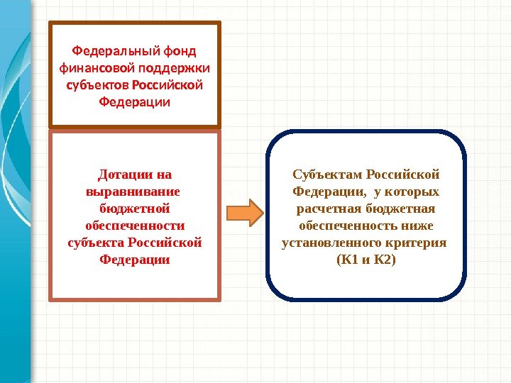Дотации на выравнивание бюджетной обеспеченности субъекта Российской Федерации Субъектам Российской Федерации, у которых расчетная бюджетная обеспеченность ниже установленного критерия (К 1 и К 2)Федеральный фонд финансовой поддержки субъектов Российской Федерации