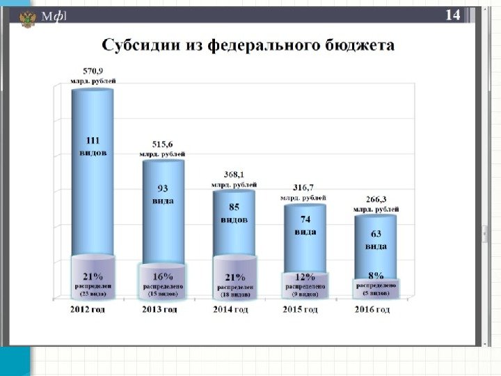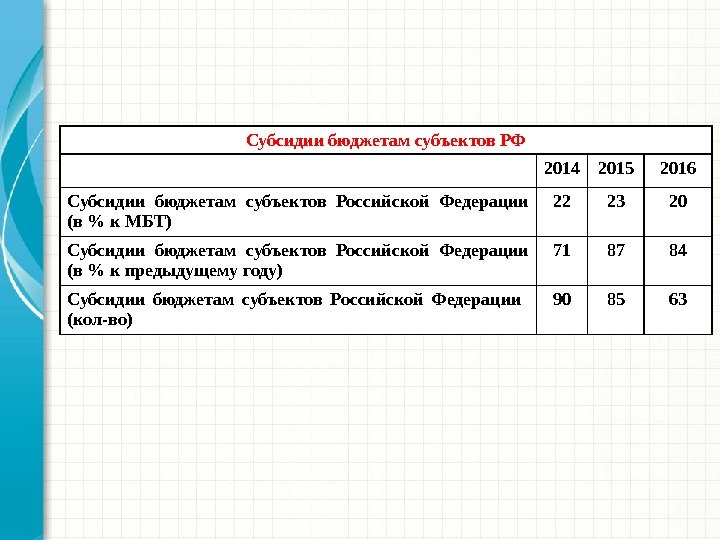 Субсидии бюджетам субъектов РФ 2014 2015 2016 Субсидии бюджетам субъектов Российской Федерации (в % к МБТ) 22 23 20 Субсидии бюджетам субъектов Российской Федерации (в % к предыдущему году) 71 87 84 Субсидии бюджетам субъектов Российской Федерации (кол-во)