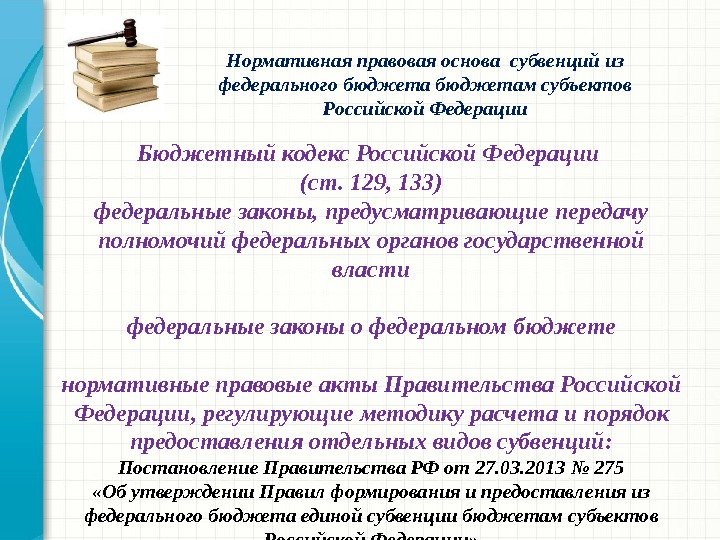 Бюджетный кодекс Российской Федерации (ст. 129, 133) федеральные законы, предусматривающие передачу полномочий федеральных органов государственной власти федеральные законы о федеральном бюджете нормативные правовые акты Правительства Российской Федерации, регулирующие методику расчета и порядок предоставления отдельных видов субвенций: Постановление Правительства РФ от 27. 03. 2013 № 275 «Об утверждении Правил формирования и предоставления из федерального бюджета единой субвенции бюджетам субъектов Российской Федерации» Нормативная правовая основа субвенций из федерального бюджетам субъектов Российской Федерации