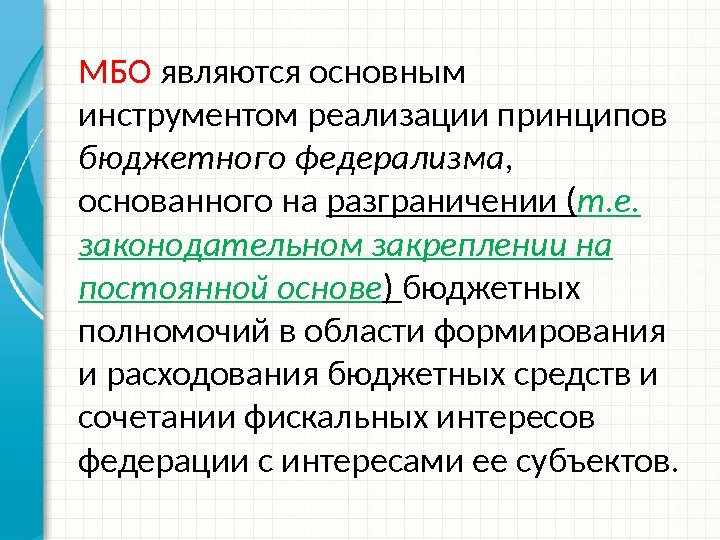 МБО являются основным инструментом реализации принципов бюджетного федерализма, основанного на разграничении ( т. е. законодательном закреплении на постоянной основе ) бюджетных полномочий в области формирования и расходования бюджетных средств и сочетании фискальных интересов федерации с интересами ее субъектов.