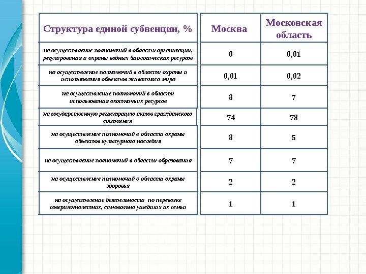 Структура единой субвенции, % на осуществление полномочий в области организации, регулирования и охраны водных биологических ресурсов на осуществление полномочий в области охраны и использования объектов животного мира на государственную регистрацию актов гражданского состояния на осуществление полномочий в области охраны объектов культурного наследия на осуществление полномочий в области образования на осуществление полномочий в области охраны здоровьяна осуществление полномочий в области использования охотничьих ресурсов на осуществление деятельности по перевозке совершеннолетних, самовольно ушедших их семьи Москва Московская область 0 0, 01 8 74 8 7 2 1 0,
