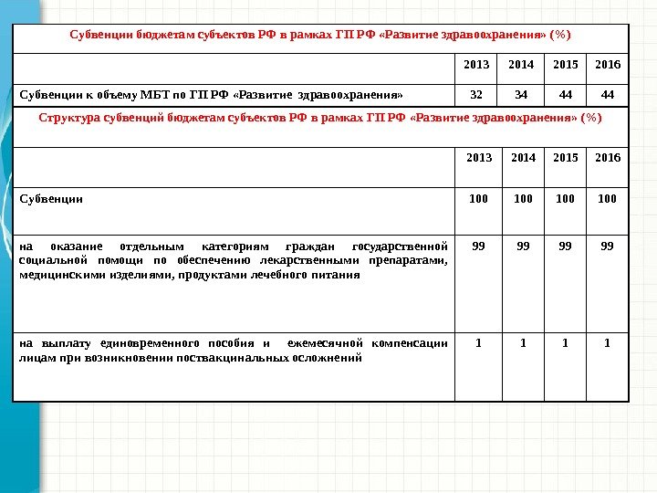Субвенции бюджетам субъектов РФ в рамках ГП РФ «Развитие здравоохранения» (%) 2013 2014 2015 2016 Субвенции к объему МБТ по ГП РФ «Развитие здравоохранения» 32 34 44 44 Структура субвенций бюджетам субъектов РФ в рамках ГП РФ «Развитие здравоохранения» (%) 2013 2014 2015 2016 Субвенции 100 100 на оказание отдельным категориям граждан государственной социальной помощи по обеспечению лекарственными препаратами, медицинскими изделиями, продуктами лечебного питания 99 99 на выплату единовременного пособия и ежемесячной компенсации лицам при возникновении поствакцинальных осложнений
