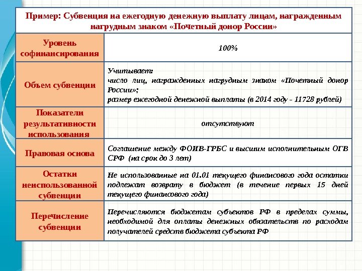 Объем субвенции Учитывает: число лиц, награжденных нагрудным знаком «Почетный донор России» ; размер ежегодной денежной выплаты (в 2014 году — 11728 рублей) Показатели результативности использования отсутствуют 100% Правовая основа Соглашение между ФОИВ-ГРБС и высшим исполнительным ОГВ СРФ (на срок до 3 лет) Пример: Субвенция на ежегодную денежную выплату лицам, награжденным нагрудным знаком «Почетный донор России» Не использованные на 01. 01 текущего финансового года остатки подлежат возврату в бюджет (в течение первых 15 дней текущего финансового года)Остатки неиспользованной субвенции Уровень софинансирования Перечисление субвенции Перечисляются бюджетам субъектов РФ в пределах суммы, необходимой для оплаты денежных обязательств по расходам получателей средств бюджета субъекта РФ
