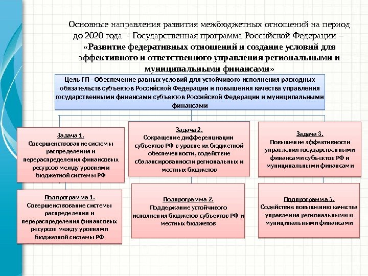 Цель ГП — Обеспечение равных условий для устойчивого исполнения расходных обязательств субъектов Российской Федерации и повышения качества управления государственными финансами субъектов Российской Федерации и муниципальными финансами Задача 2. Сокращение дифференциации субъектов РФ в уровне их бюджетной обеспеченности, содействие сбалансированности региональных и местных бюджетов Задача 3. Повышение эффективности управления государственными финансами субъектов РФ и муниципальными финансами Подпрограмма 2. Поддержание устойчивого исполнения бюджетов субъектов РФ и местных бюджетов Подпрограмма 3. Содействие повышению качества управления региональными и муниципальными финансами. Основные направления развития межбюджетных отношений на период до 2020 года — Государственная программа Российской Федерации – «Развитие федеративных отношений и создание условий для эффективного и ответственного управления региональными и муниципальными финансами» Задача 1. Совершенствование системы распределения и перераспределения финансовых ресурсов между уровнями бюджетной системы РФ Подпрограмма 1. Совершенствование системы распределения и перераспределения финансовых ресурсов между уровнями бюджетной системы РФ