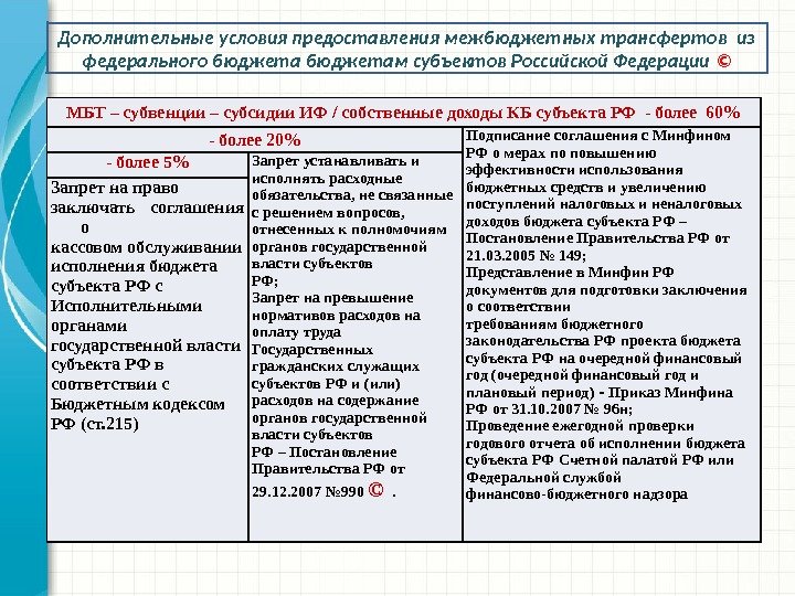 МБТ – субвенции – субсидии ИФ / собственные доходы КБ субъекта РФ — более 60% — более 20% Подписание соглашения с Минфином РФ о мерах по повышению эффективности использования бюджетных средств и увеличению поступлений налоговых и неналоговых доходов бюджета субъекта РФ – Постановление Правительства РФ от 21. 03. 2005 № 149; Представление в Минфин РФ документов для подготовки заключения о соответствии требованиям бюджетного законодательства РФ проекта бюджета субъекта РФ на очередной финансовый год (очередной финансовый год и плановый период) Приказ Минфина ‑ РФ от 31. 10. 2007 № 96 н; Проведение ежегодной проверки годового отчета об исполнении бюджета субъекта РФ Счетной палатой РФ или Федеральной службой финансово-бюджетного надзора- более 5% Запрет устанавливать и исполнять расходные обязательства, не связанные с решением вопросов, отнесенных к полномочиям органов государственной власти субъектов РФ; Запрет на превышение нормативов расходов на оплату труда Государственных гражданских служащих субъектов РФ и (или) расходов на содержание органов государственной власти субъектов РФ – Постановление Правительства РФ от 29. 12. 2007 № 990 © . Запрет на право заключать соглашения о кассовом обслуживании исполнения бюджета субъекта РФ с Исполнительными органами государственной власти субъекта РФ в соответствии с Бюджетным кодексом РФ (ст. 215) Дополнительные условия предоставления межбюджетных трансфертов из федерального бюджетам субъектов Российской Федерации ©