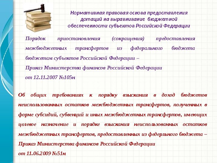Порядок приостановления (сокращения) предоставления межбюджетных трансфертов из федерального бюджетам субъектов Российской Федерации – Приказ Министерства финансов Российской Федерации от 12. 11. 2007 № 105 н Об общих требованиях к порядку взыскания в доход бюджетов неиспользованных остатков межбюджетных трансфертов, полученных в форме субсидий, субвенций и иных межбюджетных трансфертов, имеющих целевое назначение и порядке взыскания неиспользованных остатков межбюджетных трансфертов, предоставленных из федерльного бюджета – Приказ Министерства финансов Российской Федерации от 11. 06. 2009 № 51 н Нормативная правовая основа предоставления дотаций на выравнивание бюджетной обеспеченности субъектов Российской Федерации