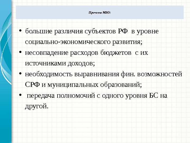 Причины МБО: • большие различия субъектов РФ в уровне социально-экономического развития; • несовпадение расходов бюджетов с их источниками доходов; • необходимость выравнивания фин. возможностей СРФ и муниципальных образований; • передача полномочий с одного уровня БС на другой.