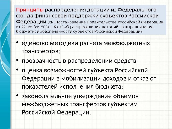 Принципы распределения дотаций из Федерального фонда финансовой поддержки субъектов Российской Федерации (. см Постановление Правительства Российской Федерации 22 2004 . N 670 « от ноября г О распределении дотаций на выравнивание » : бюджетной обеспеченности субъектов Российской Федерации • единство методики расчета межбюджетных трансфертов; • прозрачность в распределении средств; • оценка возможностей субъекта Российской Федерации в мобилизации доходов и отказ от показателей исполнения бюджета; • законодательное утверждение объемов межбюджетных трансфертов субъектам Российской Федерации.