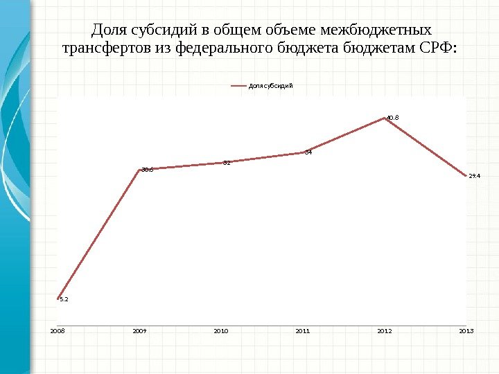 Доля субсидий в общем объеме межбюджетных трансфертов из федерального бюджетам СРФ: 2008 2009 2010 2011 2012 20135. 2 30. 6 32 34 40. 8 29. 4 Доля субсидий