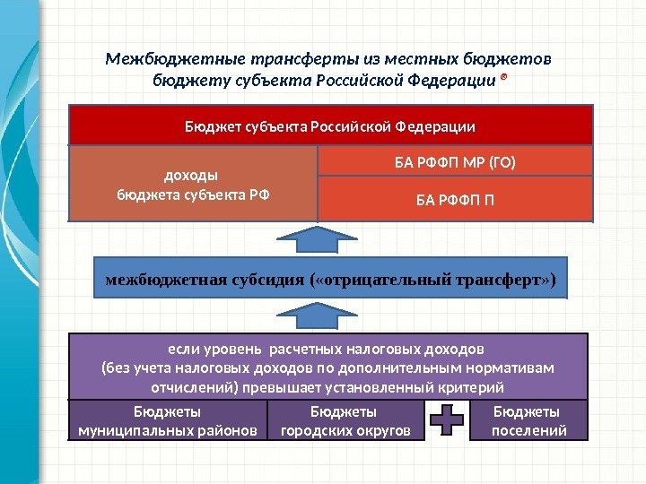 Межбюджетные трансферты из местных бюджетов бюджету субъекта Российской Федерации ® Бюджеты муниципальных районов Бюджеты городских округов Бюджеты поселений. Бюджет субъекта Российской Федерации доходы бюджета субъекта РФ БА РФФП МР (ГО) БА РФФП П межбюджетная субсидия ( «отрицательный трансферт» ) если уровень расчетных налоговых доходов (без учета налоговых доходов по дополнительным нормативам отчислений) превышает установленный критерий