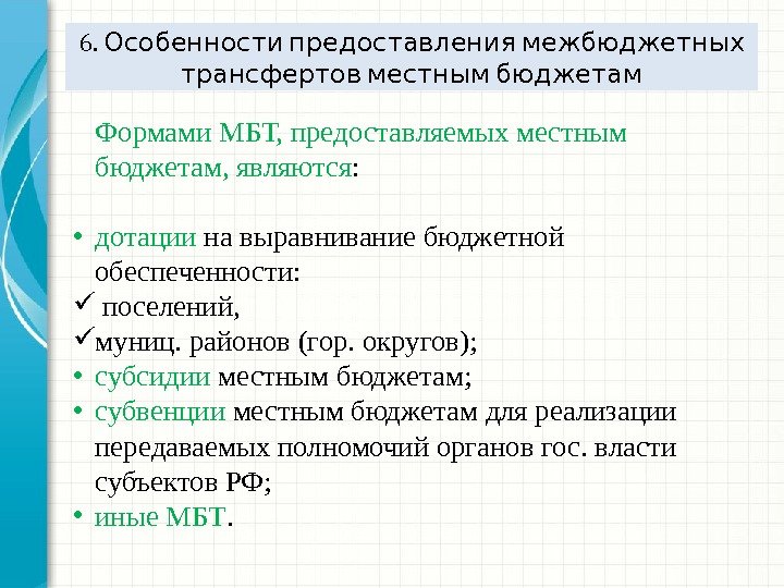 6. Особенности предоставления межбюджетных трансфертов местным бюджетам Формами МБТ, предоставляемых местным бюджетам, являются : • дотации на выравнивание бюджетной обеспеченности: поселений, муниц. районов (гор. округов); • субсидии местным бюджетам; • субвенции местным бюджетам для реализации передаваемых полномочий органов гос. власти субъектов РФ; • иные МБТ.