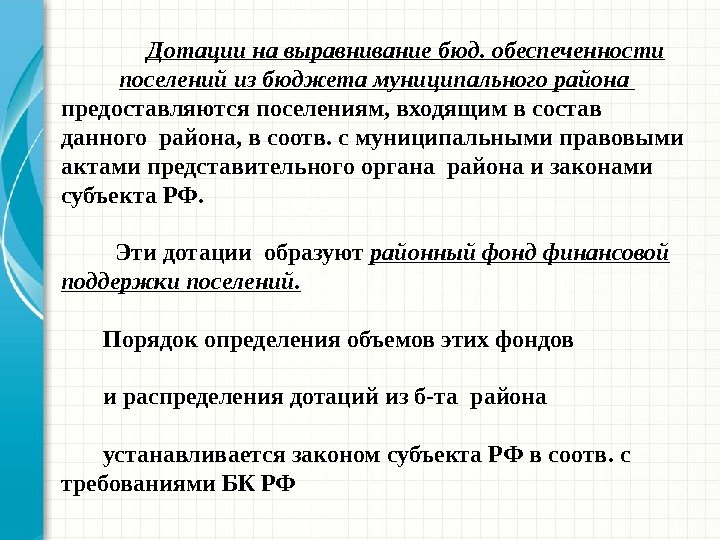 Дотации на выравнивание бюд. обеспеченности поселений из бюджета муниципального района предоставляются поселениям, входящим в состав данного района, в соотв. с муниципальными правовыми актами представительного органа района и законами субъекта РФ. Эти дотации образуют районный фонд финансовой поддержки поселений. Порядок определения объемов этих фондов и распределения дотаций из б-та района устанавливается законом субъекта РФ в соотв. с требованиями БК РФ