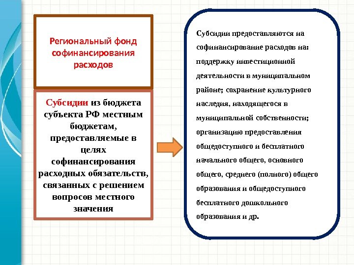 Субсидии из бюджета субъекта РФ местным бюджетам, предоставляемые в целях софинансирования расходных обязательств, связанных с решением вопросов местного значения. Региональный фонд софинансирования расходов Субсидии предоставляются на софинансирование расходов на: поддержку инвестиционной деятельности в муниципальном районе; сохранение культурного наследия, находящегося в муниципальной собственности; организацию предоставления общедоступного и бесплатного начального общего, основного общего, среднего (полного) общего образования и общедоступного бесплатного дошкольного образования и др.