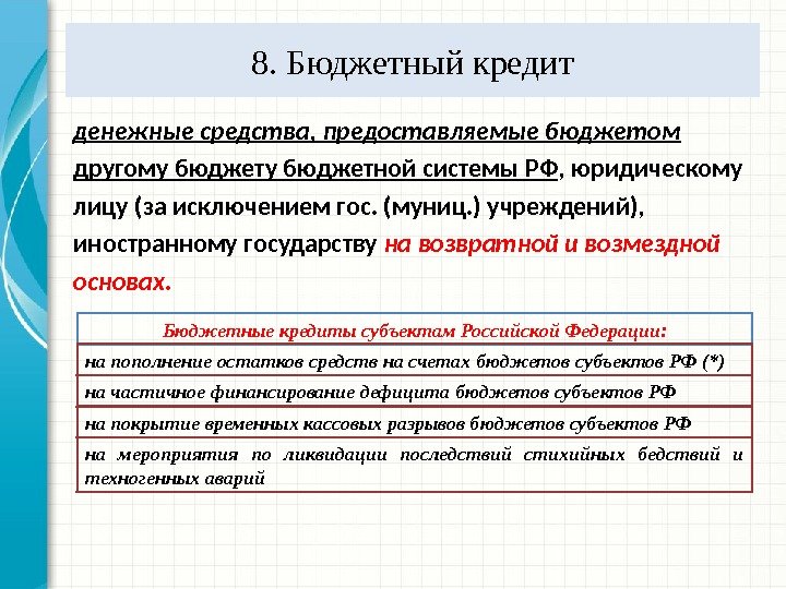 8. Бюджетный кредит денежные средства, предоставляемые бюджетом другому бюджетной системы РФ , юридическому лицу (за исключением гос. (муниц. ) учреждений), иностранному государству на возвратной и возмездной основах. Бюджетные кредиты субъектам Российской Федерации: на пополнение остатков средств на счетах бюджетов субъектов РФ (*) на частичное финансирование дефицита бюджетов субъектов РФ на мероприятия по ликвидации последствий стихийных бедствий и техногенных аварийна покрытие временных кассовых разрывов бюджетов субъектов РФ