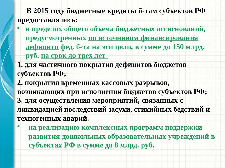 В 2015 году бюджетные кредиты б-там субъектов РФ предоставлялись: • в пределах общего объема бюджетных ассигнований, предусмотренных по источникам финансирования дефицита фед. б-та на эти цели, в сумме до 150 млрд. руб. на срок до трех лет 1. для частичного покрытия дефицитов бюджетов субъектов РФ; 2. покрытия временных кассовых разрывов, возникающих при исполнении бюджетов субъектов РФ; 3. для осуществления мероприятий, связанных с ликвидацией последствий засухи, стихийных бедствий и техногенных аварий. • на реализацию комплексных программ поддержки развития дошкольных образовательных учреждений в субъектах РФ в сумме до 8 млрд. руб.