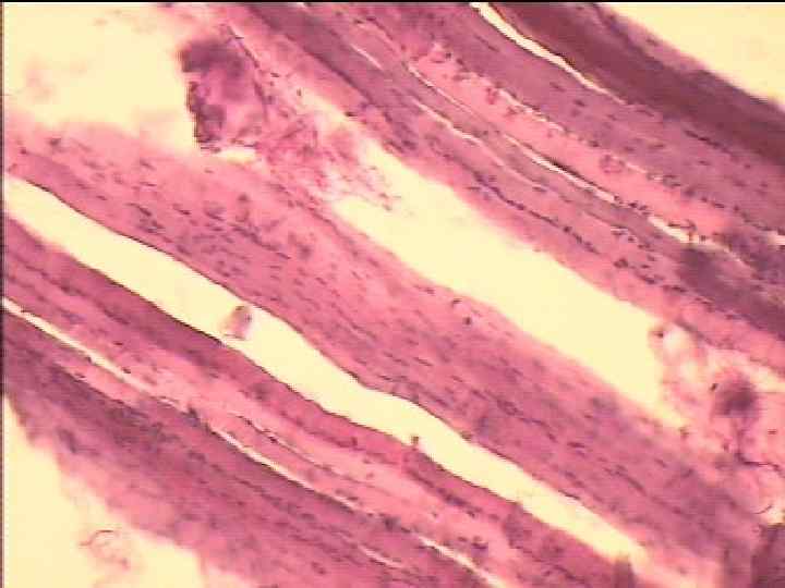 2) Сухожилие (tendo) построено по тому же принципу, что и мышечное брюшко, с той лишь разницей, что вместо мышечных волокон его пучки содержат коллагеновые волокна. Прослойки соединительной ткани внутри носят названия эндо - и пери теноний, а снаружи плотная соединительная ткань образует оболочку (эпитеноний), которая является продолжением эпимизия. Сухожилие имеет блестящий светлозолотистый цвет, резко отличающийся от красно-бурого цвета брюшка мышцы. В большинстве случаев сухожилие находится по обоим концам мышцы и прикрепляется к костям. Хотя сухожилие значительно тоньше мышечного брюшка, прочность его велика, оно способно выдерживать большую нагрузку и практически нерастяжимо. Исследования показали, что для разрыва ахиллового сухожилия у животного требуется сила от 900 кг на один кубический см.