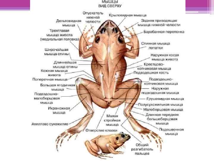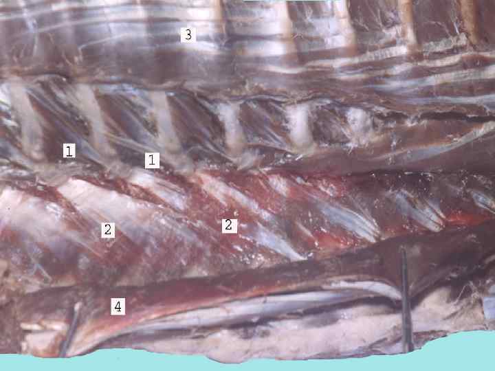 С выходом на сушу и увеличением разнообразия движений у амфибий и рептилий происходит разделение дорсальной мышцы, так же как и вентральной, на два тяжа: латеральный (поперечно-реберная мышца) и медиальный (поперечно-остистая м. ). Кроме этого, у рептилий из латерального тяжа впервые появляются подкожные мышцы, которые прикрепляются к коже.