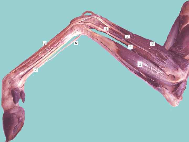 Статический аппарат тазовой конечности. При действии силы на тазовую конечность коленный сустав и заплюсневый сустав стремятся согнуться, а суставы пальцев – разогнутся. Статику коленного сустава обеспечивают 2 тяжа: 1. Представлен 3 -им малоберцовым мускулом 2. Представлен икроножной мышцей и поверхностным сгибателем пальцев • Статику сустава пальцев тазовой конечности обеспечивает сухожилия мышц как и на грудной конечности.