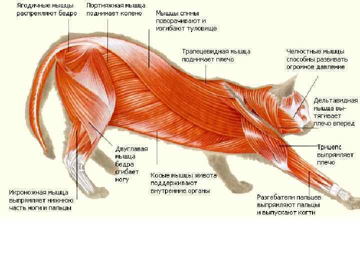 Скелетная мускулатура тела животного по выполнении функции и местоположению подразделяется на следующие группы: 1. мышцы головы 2. мышцы позвоночного столба: дорсальные и вентральные 3. мышцы грудной и брюшной стенок 4. мышцы прикрепляющие переднюю конечность к туловищу 5. мышцы грудной и тазовой конечности