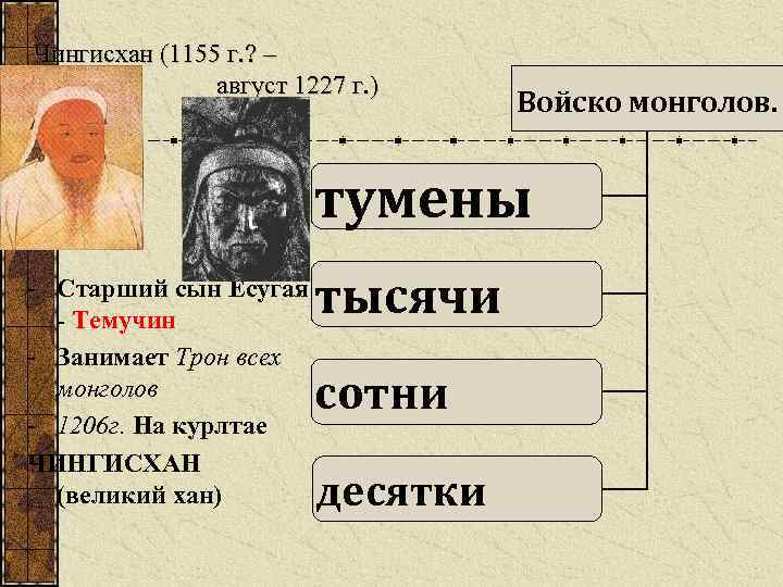 Чингисхан (1155 г. ? – август 1227 г. ) Войско монголов. тумены - Старший сын Есугая - Темучин - Занимает Трон всех монголов - 1206 г. На курлтае ЧИНГИСХАН (великий хан) тысячи сотни десятки
