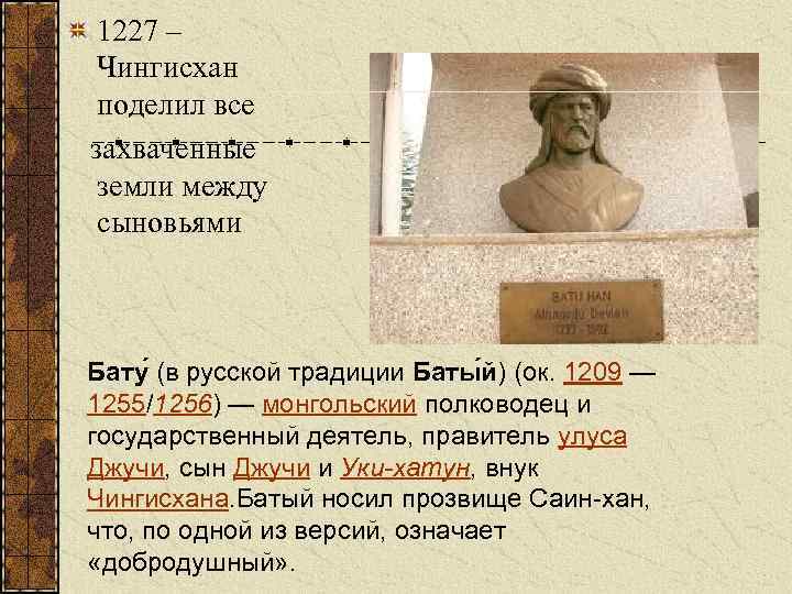 1227 – Чингисхан поделил все захваченные земли между сыновьями Бату (в русской традиции Баты й) (ок. 1209 — 1255/1256) — монгольский полководец и государственный деятель, правитель улуса Джучи, сын Джучи и Уки-хатун, внук Чингисхана. Батый носил прозвище Саин-хан, что, по одной из версий, означает «добродушный» .