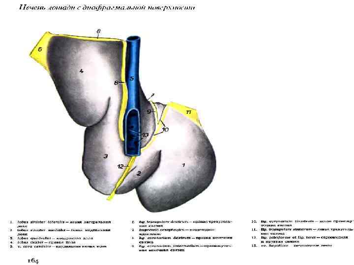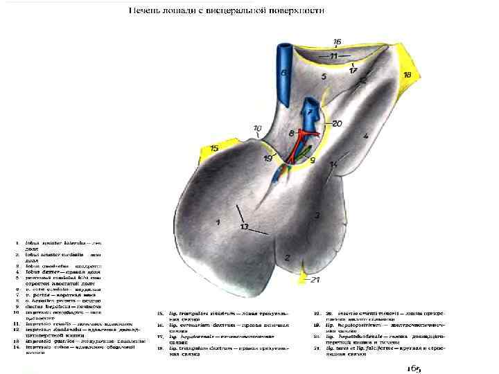 Топография : печень лошади достигает в правом подреберье уровня середины 16 ребра, в левом подреберье – области 7 -12 ребра, вентрально – нижней трети грудинных концов ребер