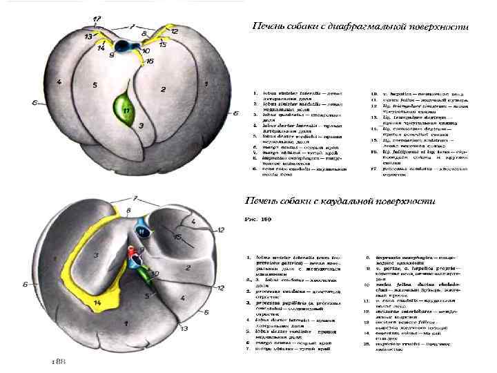 Топография: печень свиньи располагается больше в правом подреберье, каудально достигая позвоночный конец 10 -го ребра, вентрально - в области мечевидного отростка достигает брюшной стенки