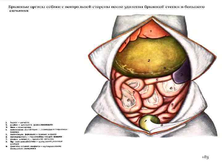 Топография: печень собаки располагается в правом и левом подреберьях и в области мечевидного хряща, прилегая к брюшной стенке
