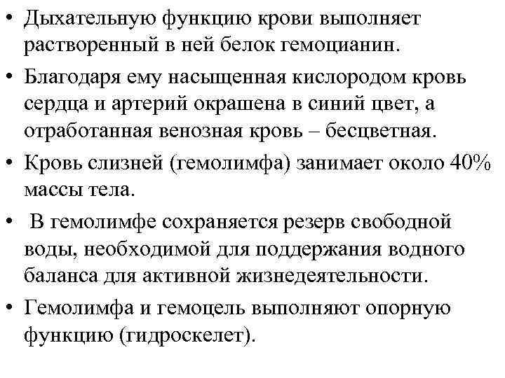 • Дыхательную функцию крови выполняет растворенный в ней белок гемоцианин. • Благодаря ему насыщенная кислородом кровь сердца и артерий окрашена в синий цвет, а отработанная венозная кровь – бесцветная. • Кровь слизней (гемолимфа) занимает около 40% массы тела. • В гемолимфе сохраняется резерв свободной воды, необходимой для поддержания водного баланса для активной жизнедеятельности. • Гемолимфа и гемоцель выполняют опорную функцию (гидроскелет).