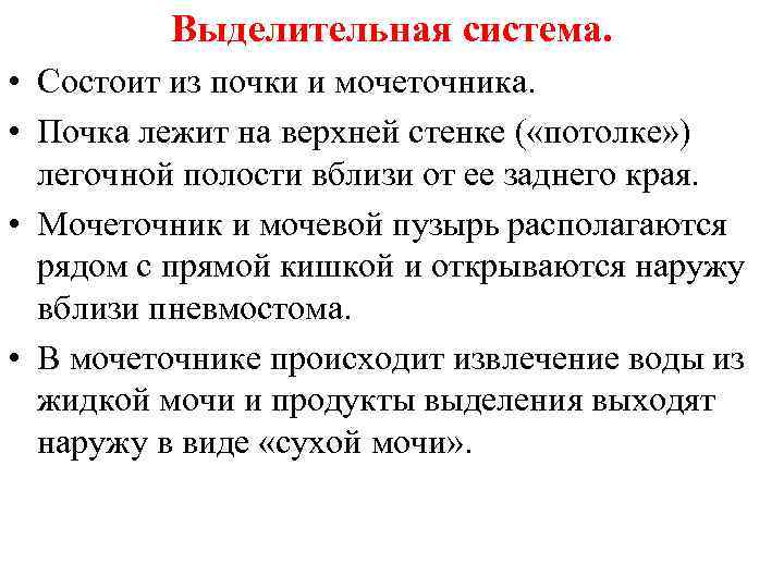 Выделительная система. • Состоит из почки и мочеточника. • Почка лежит на верхней стенке ( «потолке» ) легочной полости вблизи от ее заднего края. • Мочеточник и мочевой пузырь располагаются рядом с прямой кишкой и открываются наружу вблизи пневмостома. • В мочеточнике происходит извлечение воды из жидкой мочи и продукты выделения выходят наружу в виде «сухой мочи» .
