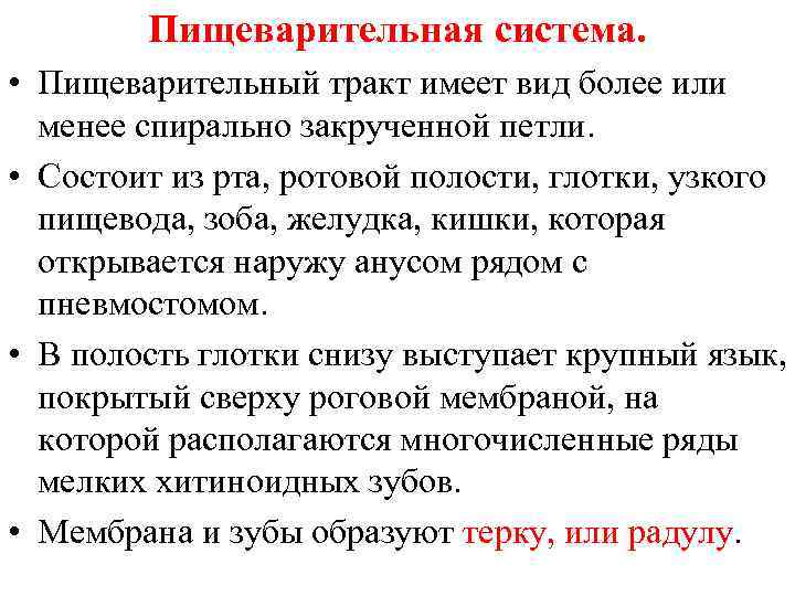 Пищеварительная система. • Пищеварительный тракт имеет вид более или менее спирально закрученной петли. • Состоит из рта, ротовой полости, глотки, узкого пищевода, зоба, желудка, кишки, которая открывается наружу анусом рядом с пневмостомом. • В полость глотки снизу выступает крупный язык, покрытый сверху роговой мембраной, на которой располагаются многочисленные ряды мелких хитиноидных зубов. • Мембрана и зубы образуют терку, или радулу.
