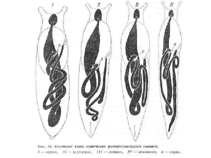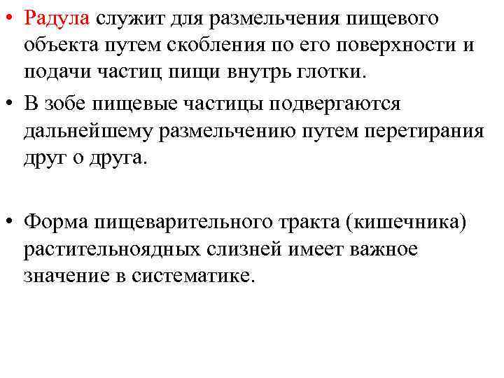 • Радула служит для размельчения пищевого объекта путем скобления по его поверхности и подачи частиц пищи внутрь глотки. • В зобе пищевые частицы подвергаются дальнейшему размельчению путем перетирания друг о друга. • Форма пищеварительного тракта (кишечника) растительноядных слизней имеет важное значение в систематике.