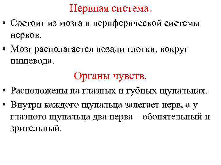 Нервная система. • Состоит из мозга и периферической системы нервов. • Мозг располагается позади глотки, вокруг пищевода. Органы чувств. • Расположены на глазных и губных щупальцах. • Внутри каждого щупальца залегает нерв, а у глазного щупальца два нерва – обонятельный и зрительный.