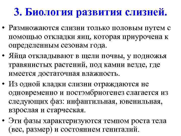 3. Биология развития слизней. • Размножаются слизни только половым путем с помощью откладки яиц, которая приурочена к определенным сезонам года. • Яйца откладывают в щели почвы, у подножья травянистых растений, под камни везде, где имеется достаточная влажность. • Из одной кладки слизни отраждаются не одновременно и постэмбриогенез слагается из следующих фаз: инфантильная, ювенильная, взрослая и старческая. • Эти фазы характеризуются темпом роста тела (вес, размер) и состоянием гениталий.