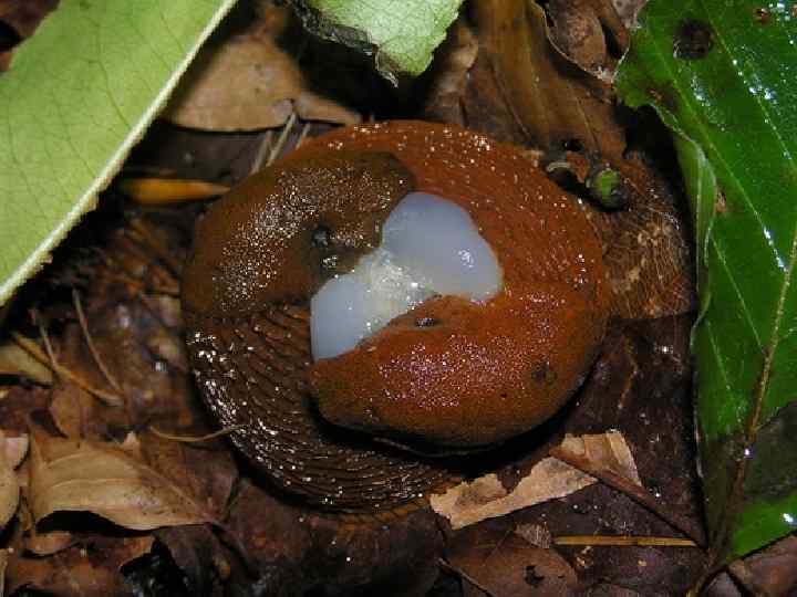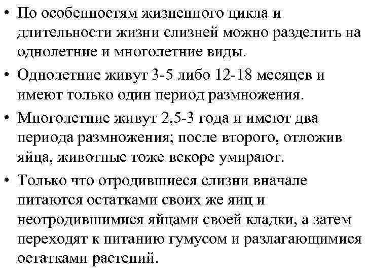 • По особенностям жизненного цикла и длительности жизни слизней можно разделить на однолетние и многолетние виды. • Однолетние живут 3 -5 либо 12 -18 месяцев и имеют только один период размножения. • Многолетние живут 2, 5 -3 года и имеют два периода размножения; после второго, отложив яйца, животные тоже вскоре умирают. • Только что отродившиеся слизни вначале питаются остатками своих же яиц и неотродившимися яйцами своей кладки, а затем переходят к питанию гумусом и разлагающимися остатками растений.