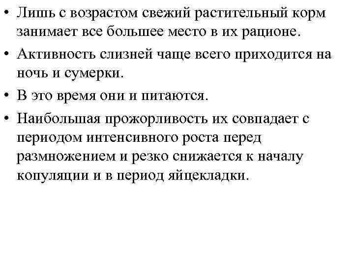 • Лишь с возрастом свежий растительный корм занимает все большее место в их рационе. • Активность слизней чаще всего приходится на ночь и сумерки. • В это время они и питаются. • Наибольшая прожорливость их совпадает с периодом интенсивного роста перед размножением и резко снижается к началу копуляции и в период яйцекладки.