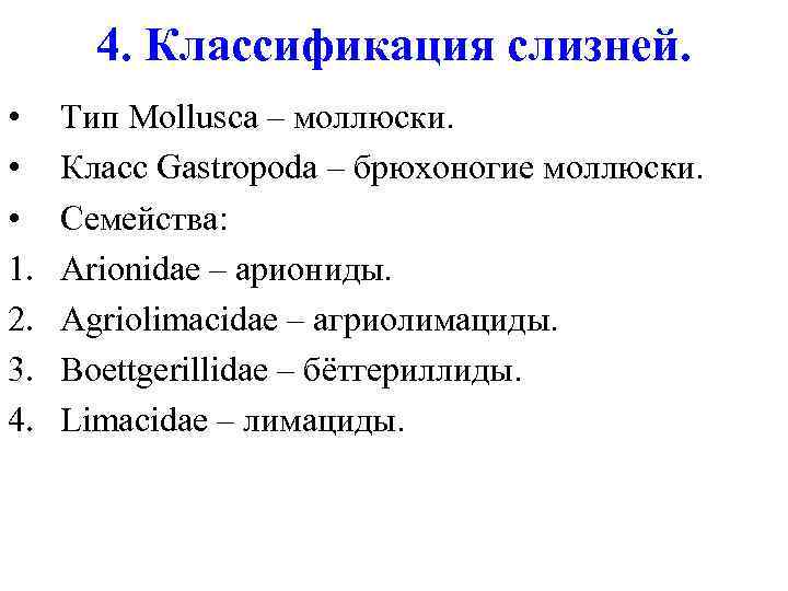 4. Классификация слизней. • • • 1. 2. 3. 4. Тип Mollusca – моллюски. Класс Gastropoda – брюхоногие моллюски. Семейства: Arionidae – ариониды. Agriolimacidae – агриолимациды. Boettgerillidae – бётгериллиды. Limacidae – лимациды.