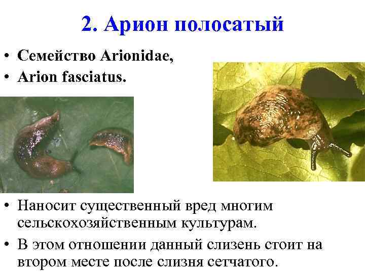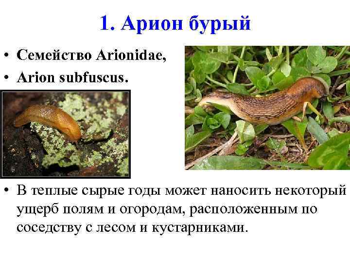 1. Арион бурый • Семейство Arionidae, • Arion subfuscus. • В теплые сырые годы может наносить некоторый ущерб полям и огородам, расположенным по соседству с лесом и кустарниками.