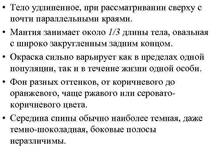 • Тело удлиненное, при рассматривании сверху с почти параллельными краями. • Мантия занимает около 1/3 длины тела, овальная с широко закругленным задним концом. • Окраска сильно варьирует как в пределах одной популяции, так и в течение жизни одной особи. • Фон разных оттенков, от коричневого до оранжевого, чаще ржавого или сероватокоричневого цвета. • Середина спины обычно наиболее темная, даже темно-шоколадная, боковые полосы неразличимы.
