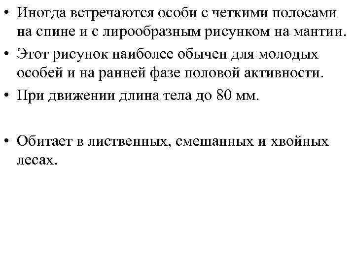 • Иногда встречаются особи с четкими полосами на спине и с лирообразным рисунком на мантии. • Этот рисунок наиболее обычен для молодых особей и на ранней фазе половой активности. • При движении длина тела до 80 мм. • Обитает в лиственных, смешанных и хвойных лесах.