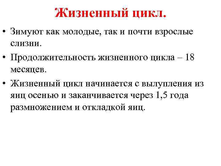 Жизненный цикл. • Зимуют как молодые, так и почти взрослые слизни. • Продолжительность жизненного цикла – 18 месяцев. • Жизненный цикл начинается с вылупления из яиц осенью и заканчивается через 1, 5 года размножением и откладкой яиц.