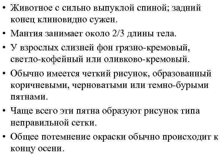 • Животное с сильно выпуклой спиной; задний конец клиновидно сужен. • Мантия занимает около 2/3 длины тела. • У взрослых слизней фон грязно-кремовый, светло-кофейный или оливково-кремовый. • Обычно имеется четкий рисунок, образованный коричневыми, черноватыми или темно-бурыми пятнами. • Чаще всего эти пятна образуют рисунок типа неправильной сетки. • Общее потемнение окраски обычно происходит к концу осени.