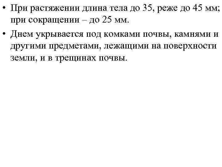 • При растяжении длина тела до 35, реже до 45 мм; при сокращении – до 25 мм. • Днем укрывается под комками почвы, камнями и другими предметами, лежащими на поверхности земли, и в трещинах почвы.