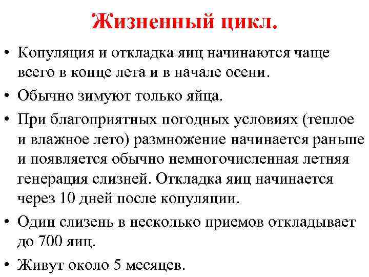 Жизненный цикл. • Копуляция и откладка яиц начинаются чаще всего в конце лета и в начале осени. • Обычно зимуют только яйца. • При благоприятных погодных условиях (теплое и влажное лето) размножение начинается раньше и появляется обычно немногочисленная летняя генерация слизней. Откладка яиц начинается через 10 дней после копуляции. • Один слизень в несколько приемов откладывает до 700 яиц. • Живут около 5 месяцев.