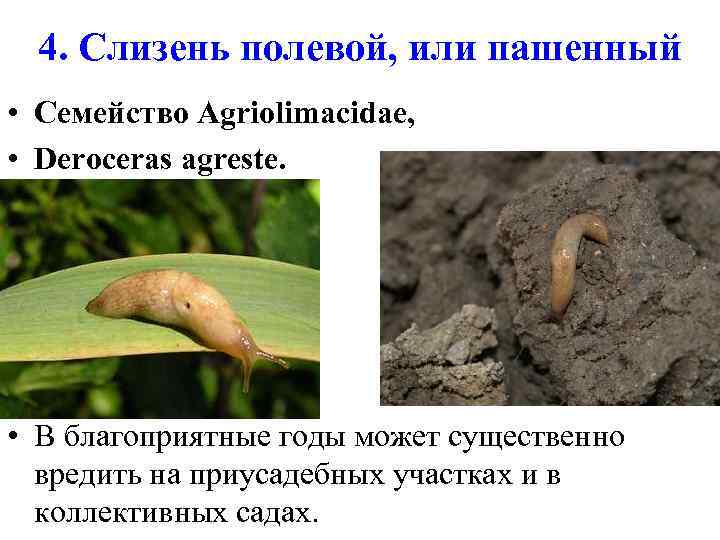 4. Слизень полевой, или пашенный • Семейство Agriolimacidae, • Deroceras agreste. • В благоприятные годы может существенно вредить на приусадебных участках и в коллективных садах.