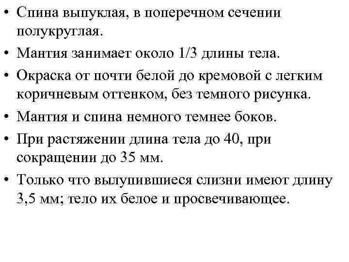 • Спина выпуклая, в поперечном сечении полукруглая. • Мантия занимает около 1/3 длины тела. • Окраска от почти белой до кремовой с легким коричневым оттенком, без темного рисунка. • Мантия и спина немного темнее боков. • При растяжении длина тела до 40, при сокращении до 35 мм. • Только что вылупившиеся слизни имеют длину 3, 5 мм; тело их белое и просвечивающее.
