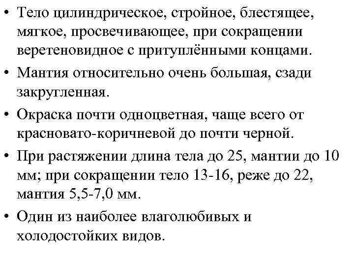 • Тело цилиндрическое, стройное, блестящее, мягкое, просвечивающее, при сокращении веретеновидное с притуплёнными концами. • Мантия относительно очень большая, сзади закругленная. • Окраска почти одноцветная, чаще всего от красновато-коричневой до почти черной. • При растяжении длина тела до 25, мантии до 10 мм; при сокращении тело 13 -16, реже до 22, мантия 5, 5 -7, 0 мм. • Один из наиболее влаголюбивых и холодостойких видов.