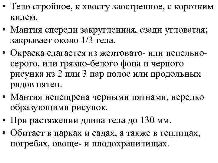 • Тело стройное, к хвосту заостренное, с коротким килем. • Мантия спереди закругленная, сзади угловатая; закрывает около 1/3 тела. • Окраска слагается из желтовато- или пепельносерого, или грязно-белого фона и черного рисунка из 2 пли 3 пар полос или продольных рядов пятен. • Мантия испещрена черными пятнами, нередко образующими рисунок. • При растяжении длина тела до 130 мм. • Обитает в парках и садах, а также в теплицах, погребах, овоще- и плодохранилищах.