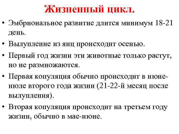 Жизненный цикл. • Эмбриональное развитие длится минимум 18 -21 день. • Вылупление из яиц происходит осенью. • Первый год жизни эти животные только растут, но не размножаются. • Первая копуляция обычно происходит в июнеиюле второго года жизни (21 -22 -й месяц после вылупления). • Вторая копуляция происходит на третьем году жизни, обычно в мае-июне.